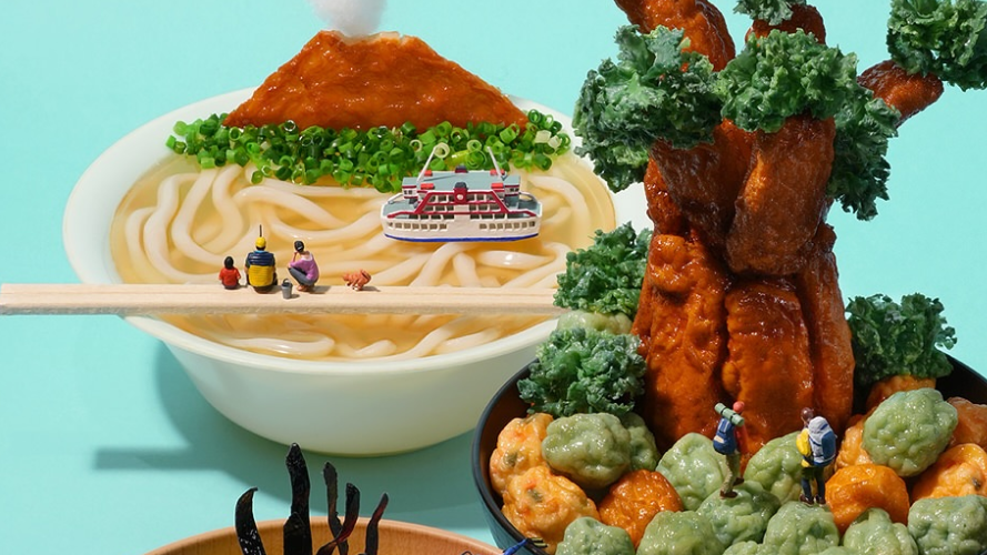 投稿では、鹿児島の情報番組「どーんと鹿児島」のオープニング用に制作した作品「Delicious Kagoshima」を公開。桜島、屋久島、鶏飯など、鹿児島の風土や名物料理を丼で表現するという“見立て”の妙技が光るユニークな一作だ。田中は「心を込めて作りました」と語り、明日から始まる【田中達也展 みたてのくみたて in 鹿児島】での展示も告知した。