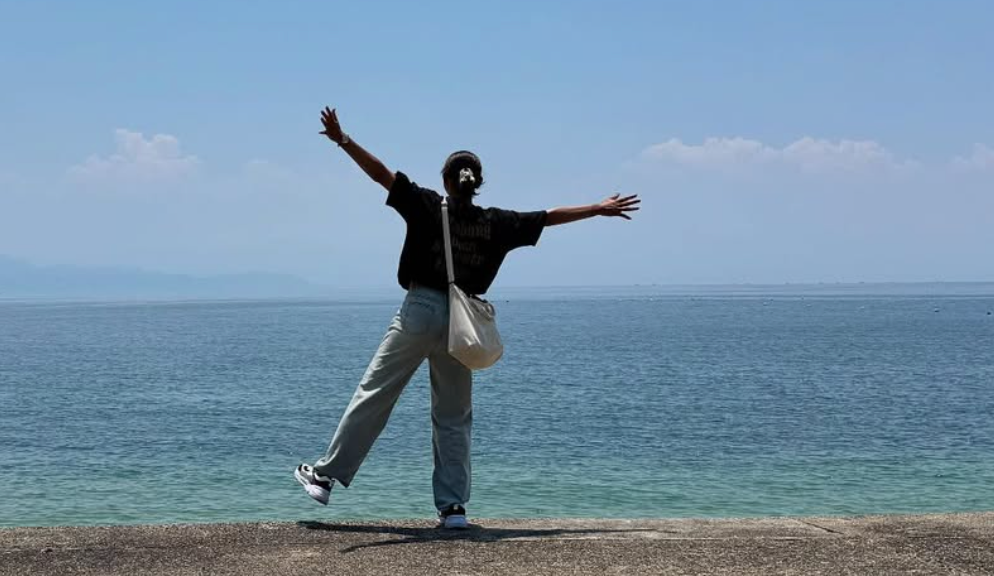 写真には、快晴の空の下、防波堤で両手を広げて海を楽しむ野口選手の後ろ姿が写っており、彼女のリラックスした休日の一コマが伝わってくる。