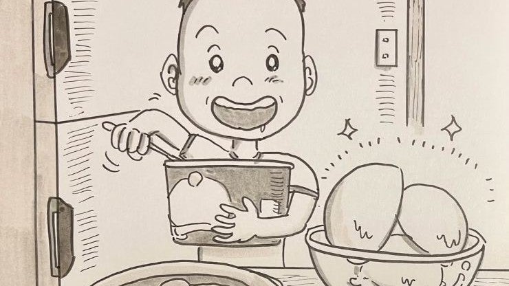 「デカい箱のアイスクリーム。子供の頃、冷蔵庫を開けるとたまにあって、嬉しかったなぁ。誰かから貰った特別な、デカい箱のアイスクリーム。これまたデカいスプーンで、3〜4回お皿に盛って眺める。食べ過ぎると怒られるので笑、怒られないギリギリの量を食べる。」と綴り、1枚のイラストをアップした。