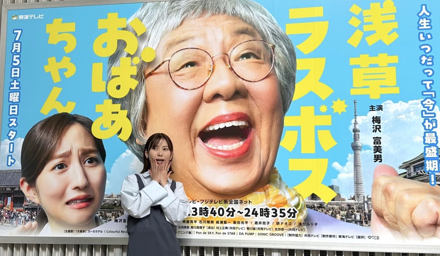土曜ドラマ「浅草ラスボスおばあちゃん」のポスター前での写真も披露し、スリットスカートから美脚をチラ見せしつつ「ついに明日放送です!」と締めくくった。