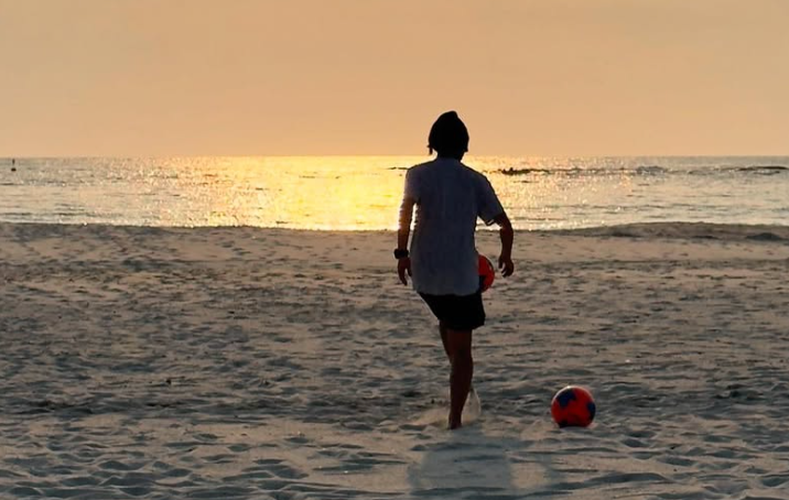 投稿画像には、海辺に沈みゆく太陽を背に、ひとりボールを蹴る後ろ姿が映っている。
