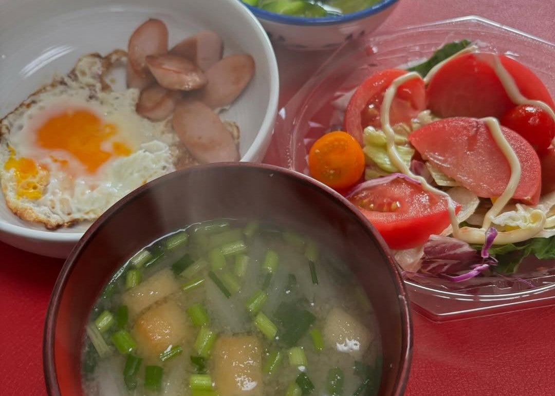 目玉焼きにサラダ、みそ汁と一汁三菜が揃っており、栄養バランへの配慮が大いに感じられる。