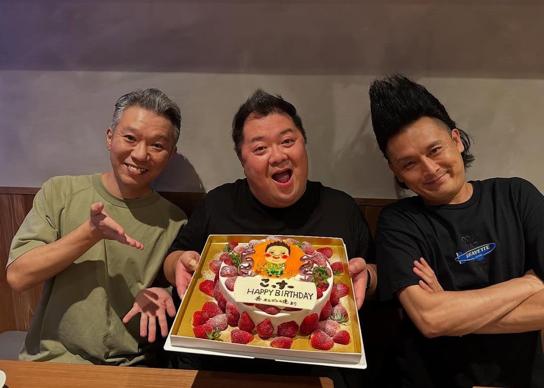 ケーキの中央には、小杉氏をモチーフにデザインされた可愛らしいキャラクターが見られ、スリーショットからは3人の元気に満ち溢れた笑顔と仲の良さが伝わってくる。