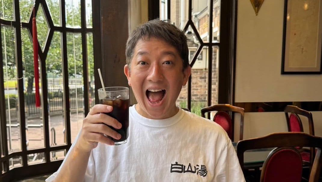 胸に”白山湯”のプリントが入った白いTシャツを着用している高橋。「#京都大作戦#京都の銭湯最高」と、ドリンクを片手に楽しそうな笑顔を見せている。