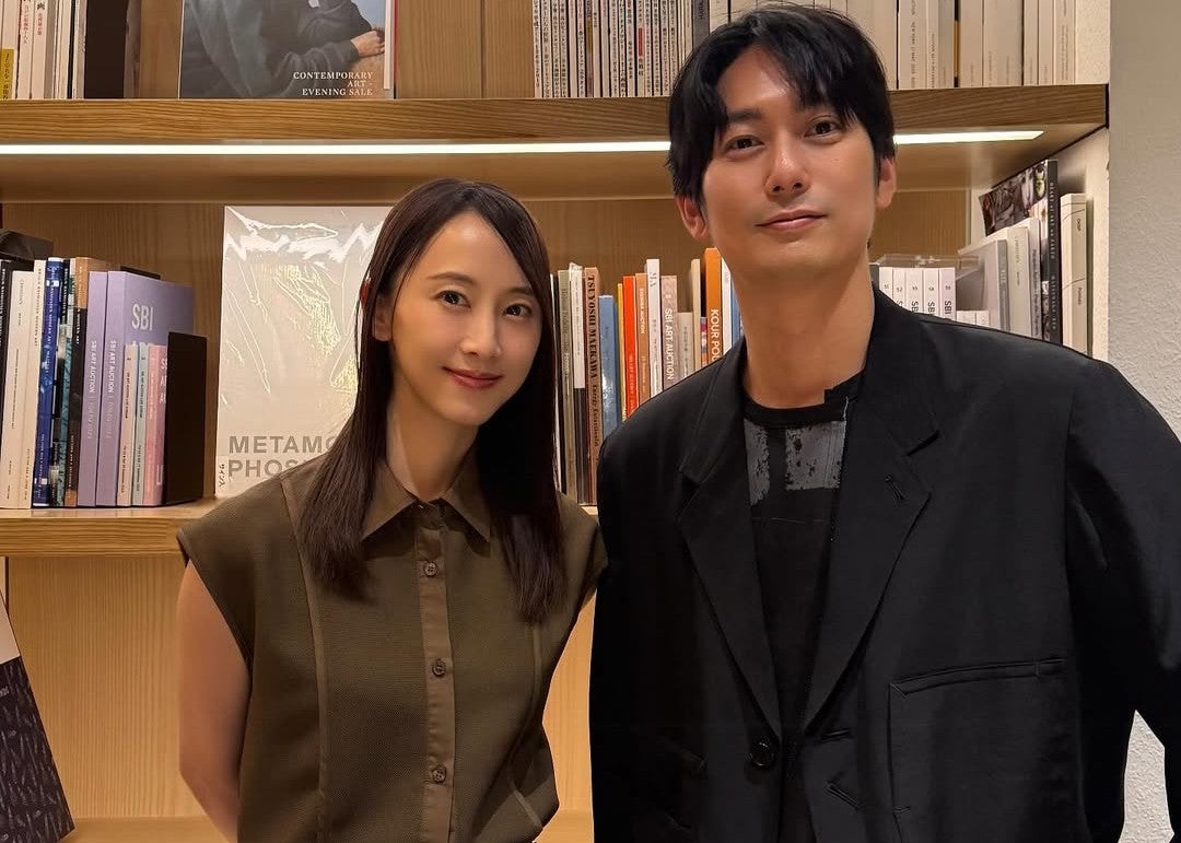 ツーショットでは2人とも爽やかな笑顔を見せており、バックの本棚も美しく本が整理整頓されており、落ち着いた雰囲気も漂っている。