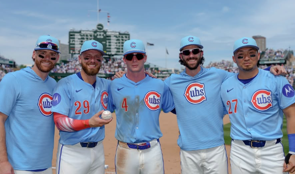 写真には、薄い青色のビンテージ風ユニフォームに身を包んだカブスの若手選手5人が、ウィグリー・フィールドのグラウンド上で肩を並べて笑顔を見せる姿が捉えられている。