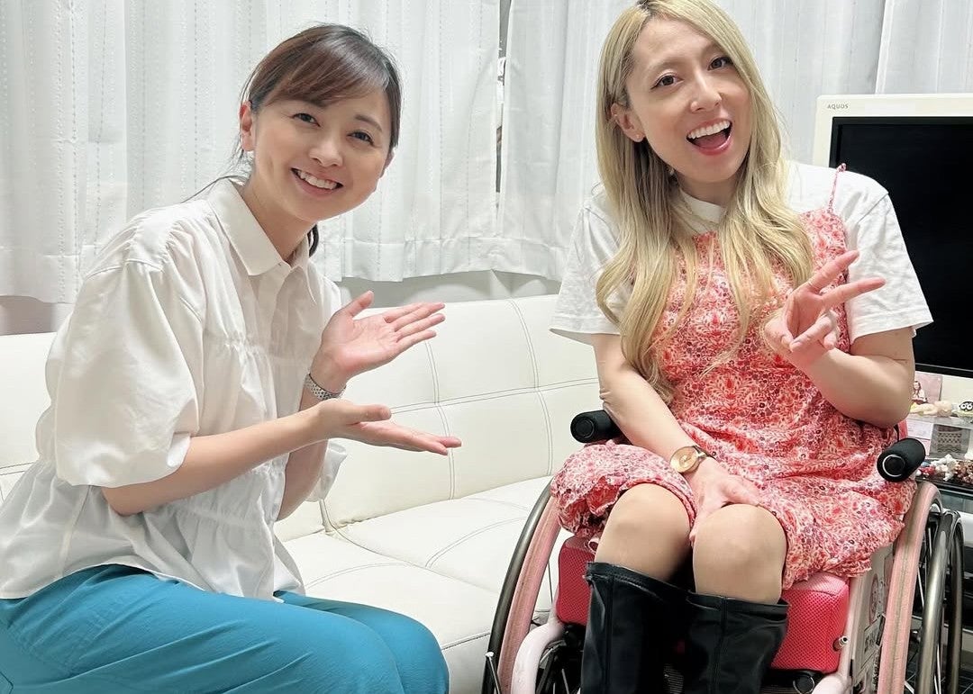車いすに乗った中嶋涼子は華やかなピンク系カラーの服を着ており、キリっと明るい笑顔を見せている。