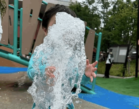 噴射した水がおぱぴまると同じ背の高さほどで止まっており、背比べと表現。