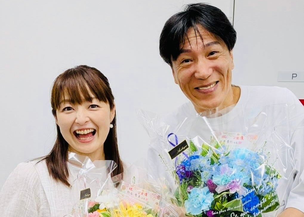 1枚目のツーショットでは、手に持った花籠のデザインが繊細で釘付けになるような美しさがあり、2人とも元気いっぱいの笑顔を見せている。