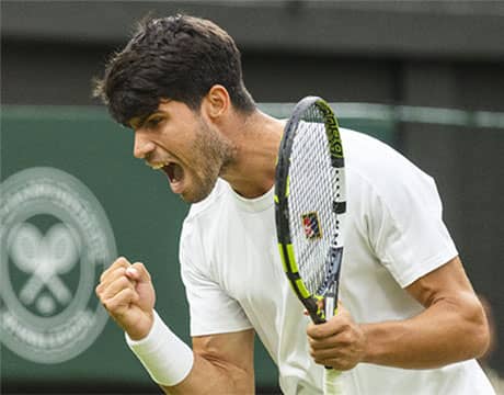 テニスのウィンブルドン(イギリス/ロンドン、芝、グランドスラム)は日本時間7日(現地6日)、男子シングルス4回戦が行われ、第2シードのC・アルカラス(スペイン)が第14シードのA・ルブレフを6-7 (5-7), 6-3, 6-4, 6-4の逆転で下し、3年連続3度目のベスト8進出を果たし大会3連覇まであと3勝に迫るとともに、マッチ連勝記録を22に伸ばした。
