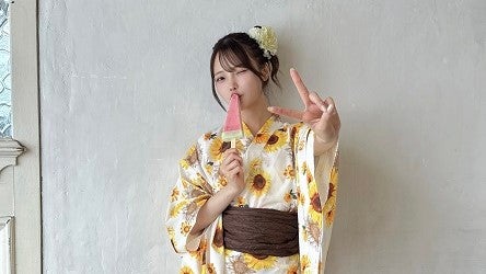 「今年初の浴衣を着ました」とヒマワリの絵文字とともに投稿されたのは、多くのヒマワリが散りばめられた浴衣を着てアイスを口にする2枚の写真。夏らしい装いで涼しげな可愛らしい姿を披露した。