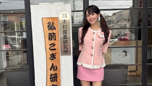 「青森来たぞ〜〜!!リンゴジュースのむぞ〜〜!!」という言葉とともに、青森県の伝統工芸「津軽こぎん刺し」によって作られた製品の販売などを行う弘前こぎん研究所の前で撮られた写真を投稿。レトロな雰囲気のミニスカートから伸びる脚が美しく、スタイルの良さが伝わってくる1枚である。