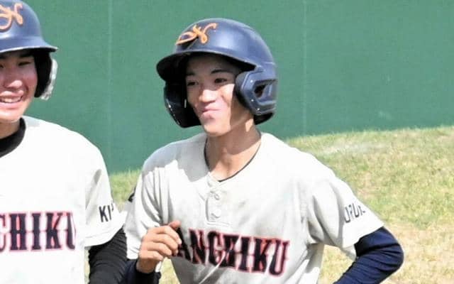 南筑の主将、中川櫂成選手(3年)は2点をリードされて迎えた九回表、先頭で打席に立った。バットを地面に軽くたたき、構える。「絶対、次につなげよう」。振り抜いた打球は右中間へ。一塁でベンチに向かって拳を高くかかげた。