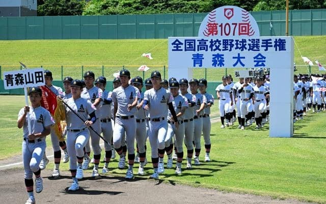 第107回全国高校野球選手権青森大会は11日、青森市の県営野球場で開会式を行った。晴天の下、48チーム(52校)の選手たちが入場行進し、観客から大きな拍手が送られた。