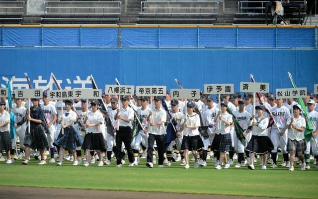 第107回全国高校野球選手権愛媛大会の開会式が11日、松山市の坊っちゃんスタジアムであった。小雨が上がった晴天のグラウンドを、55校49チームの球児らが堂々と行進した。試合は12日から始まる。