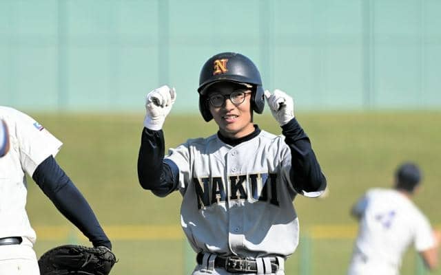 野球未経験の楢舘選手はこの日、一塁コーチのスタートとなった。チーム初安打を長根選手が放つと、我がことのように喜んだ。五回裏2死、代打で打席に立った。「何を打ったのかは分からない」が、右安打に。