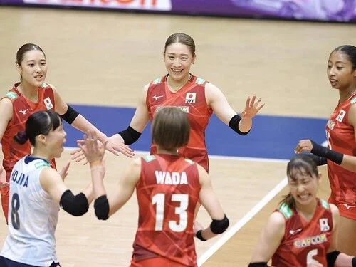 石川真佑を中心に得点を喜ぶ日本の選手たち photo by Sportshochi/AFLO