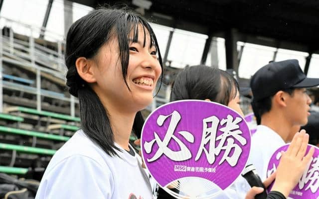 「ナイスバッティング!」。2点リードで迎えた二回表2死一、二塁、適時二塁打で2点を追加すると、スタンドにいた千種のマネジャー沢田朱里さん(3年)は、声援を送りながら「必勝」と書かれたうちわをたたいた。
