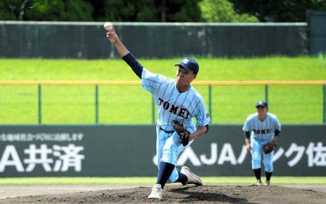 東明館の溝部聖真(しょうま)投手(3年)は初戦に続きリードされた場面の3番手で登板した。「自分の投球で攻撃へいい流れを持っていこうと思ったが、それができずに悔しい」。六回から登板し、4回を無失点。抑えただけでは満足できなかった。