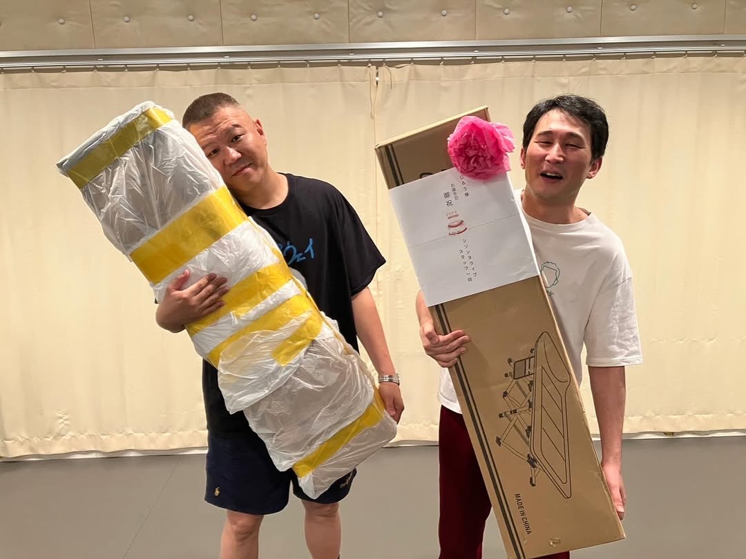 シソンヌ・じろう、相方の長谷川忍と簡易ベッドを抱えながら仲睦まじいツーショットを披露 | 話題の投稿