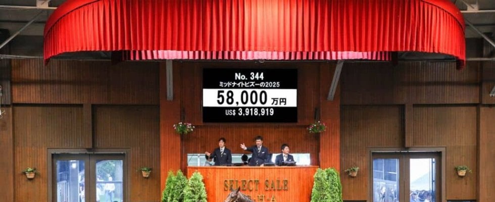 7月15日、北海道苫小牧にあるノーザンホースパークで、日本最大のサラブレッド市場「セレクトセール2025」の2日目が開幕。当歳馬セールにて上場番号344番・ミッドナイトビズーの2025(牡)が5億8000万円で落札された。