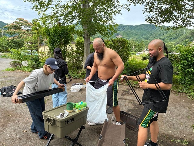 あの人気プロレスラーが自身のモノマネ芸人らとキャンプを満喫!?キャンプ飯・巨大〇〇にファン「これこそ男の肉料理」