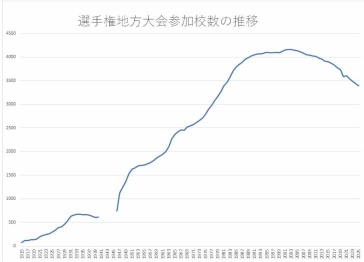しかしここから参加校数は徐々に坂道を下り始める。2012年には3985校と4000校を割り込み、新型コロナ禍で全国大会が中止になった2020年には3589校、さらに23年には3486校、25年時点では3396校となっている。日本高野連加盟校数は25年時点で3768校だから、372校が加盟するものの地方大会に参加していない計算になる。