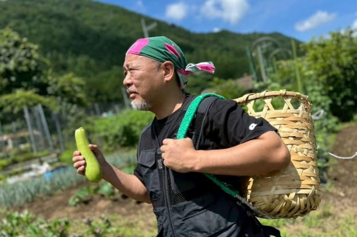 写真では、竹製の収穫かごを背負い、山々を背景に青空の下で野菜を手にするマキタスポーツの自然体な表情が印象的だ。