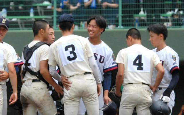 試合後、広島商の選手と抱き合い、健闘をたたえ合った。「ナイスピッチャー」と声をかけられると、拍手をしながらベンチに引き揚げた。