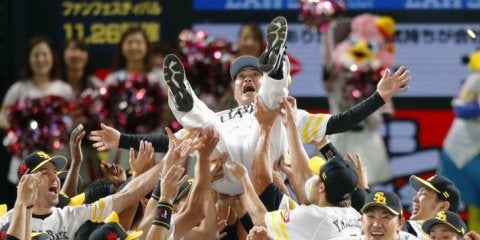 2年ぶりの日本シリーズ進出を決め、胴上げされるソフトバンクの工藤監督=22日、福岡市のヤフオクドーム【写真提供:共同通信…