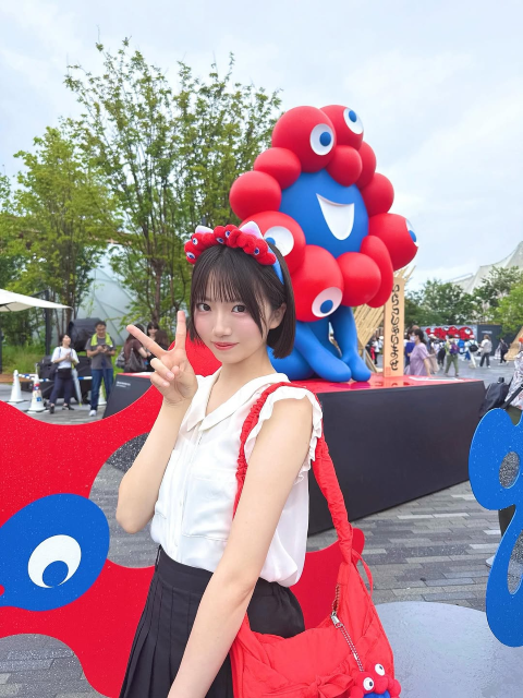 「ミャクミャクにも会えてはっぴ~すぎた」虹コン・大和明桜、ミャクミャクカチューシャONで可愛すぎるスマイル!