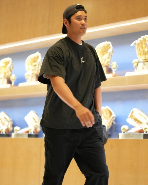 大谷翔平が歩く「MVPへの静かな道」、トロフィーの壁を背にした「王者の風格」