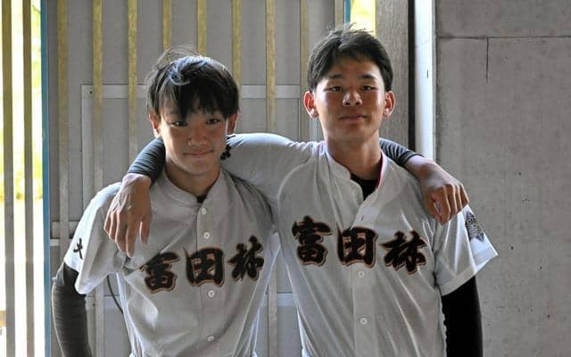 試合後、肩を組む富田林の梅川璃恩投手(右)と捕手の松本泰知主将=2025年7月19日、GOSANDO南港、武井風花撮影