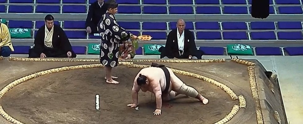 立ち合い、輝の里の懐に勢いよく飛び込んでいった祥乃山だったが、その直後に輝の里が右手でバチンと一発をお見舞いした。豪快に吹っ飛んでしまった祥乃山は、真っすぐに体が伸び、コロコロと転がりながら土俵下へとドスン。この光景に客席はざわついていた。