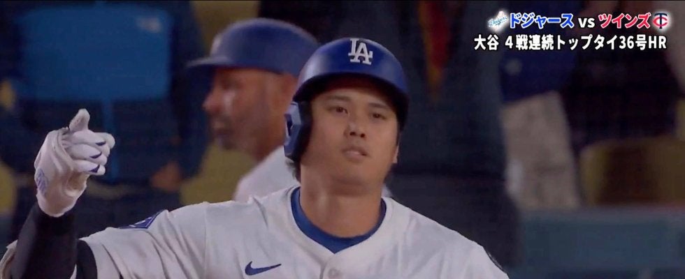 ドジャースの大谷翔平投手が「2番・DH」でスタメン出場。9回二死一塁の場面で日本選手初となる4試合連続の36号2ランホームランを放った。先発した同僚の山本由伸投手が降板した後の連日アーチに球場は一気に沸騰。この一発で再びリーグトップのスアレスに並んだ。