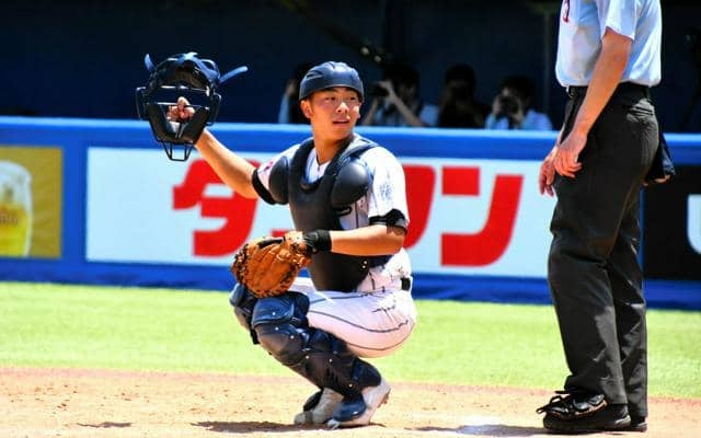 岩倉の捕手、河村=2025年7月23日午前11時36分、神宮、武田遼撮影