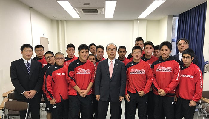 全国大会初出場を決めた開志国際高を激励に訪れたJAFA国吉会長(中央)写真提供:開志国際高校