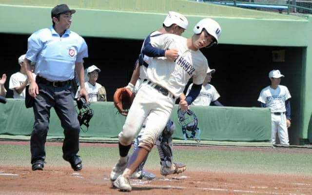 そんな見目を楽にしたい、と気を吐いたのが相棒の北村駿磨(しゅんま)(3年)だ。入学から2年半、バッテリーを組んできた。初回の打席、北村は2ボール2ストライクと追い込まれてから、2点を先取する適時三塁打を放つ。