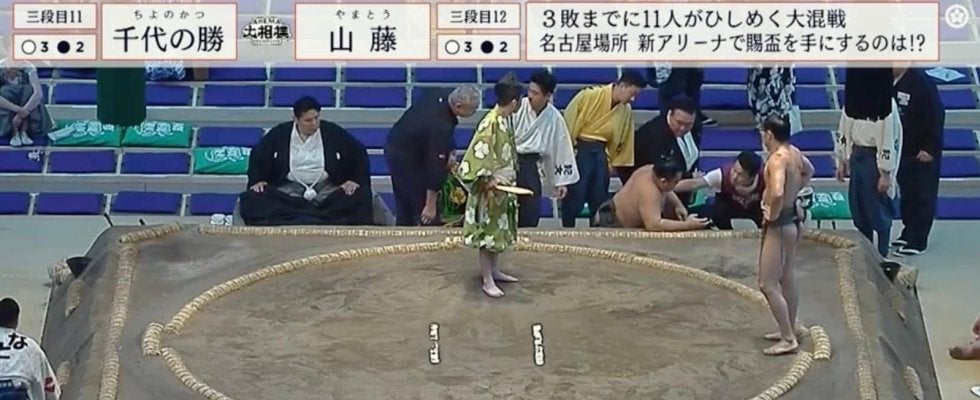まさかの決着に客席からは悲鳴も。落ちた千代の勝はすぐに起き上がれず、心配した相手力士や行司、審判の親方が様子を見にいったほか、救急救命士も駆けつける事態に。千代の勝は悶絶するように足をバタつかせ呻いていたが、その後、自ら立ち上がって土俵に上り、館内には安堵の拍手が沸き起こった。千代の勝は今場所勝ち越しとなる4勝目。敗れた山藤は3敗目を喫した。