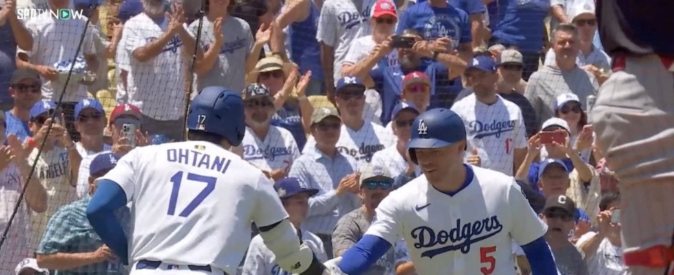 ドジャースの大谷翔平投手が「2番・DH」でスタメン出場し、初回の第1打席で37号ソロホームラン。ダイヤモンドを一周してホームに還ると、ベンチ前でフリーマン内野手が笑顔の"お辞儀パフォーマンス"で迎えた。