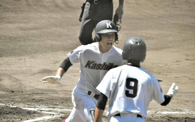本塁打を放って生還する橿原の4番、長江宗一郎選手=2025年7月26日午前10時34分、奈良県橿原市のさとやくスタジアム