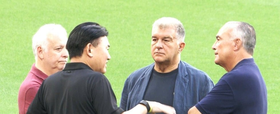 そんな中、ヴィッセル神戸の会長で楽天グループ株式会社の三木谷浩史社長もピッチに登場。バルセロナのジョアン・ラポルタ会長も姿を現わすと、ハグをしてそのまま青空トップ会談となり、日本はもちろんスペインのメディアのカメラマンたちも一斉にカメラを向けていた。途中にはバルサのハンジ・フリック監督とも挨拶を交わしていた。