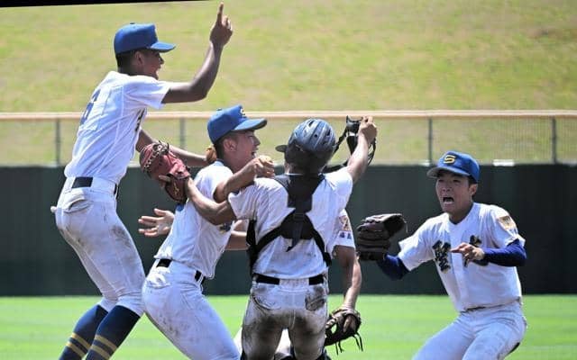 優勝を決め喜ぶ聖光学院の選手たち=2025年7月25日午後0時37分、ヨークいわき、荒川公治撮影