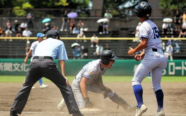 2点を追う小松大谷は九回表、犠飛で1点をかえした。続く2死二塁で5番・胡摩結月選手(3年)が打席に入った。「(あと1死で試合終了などとは)何も考えないように」と、スライダーを力強く捉えた。打球は中堅手が大きく伸ばしたグラブの上を越え、三塁に滑り込み、大きくほえた。
