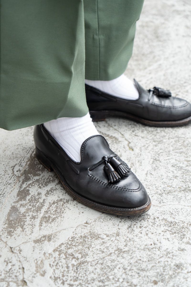 圧倒的な存在感を放つワコマリアのシャツ。その派手さをマイルドに中和する効果も“カーキ”にはあるようだ。SHIOさんはニートのスラックスをカーキでセレクト。テーパードシルエット&クリースが美しく、レオパード柄のブラウンカラーとも実に好相性だ。足元のオールデンも、良品を知るいい大人のチョイス。