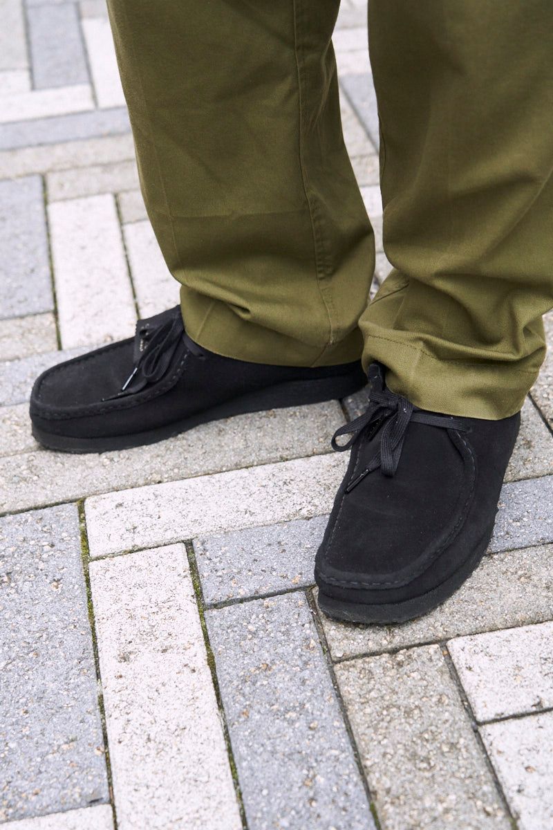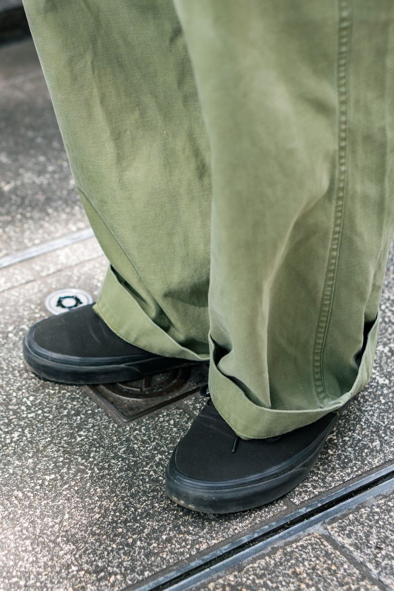 お笑いコンビ「滝音」の秋定さんもカーキのファティーグパンツを愛用中。古着だそうだがサイズ感も絶妙にちょうどよく、見事に自分の物としてはきこなしている。Tシャツの風合いもヴィンテージ感があって馴染みよく、パープルレーベルのミニバッグもアースカラーで収まり良し。締めは品のあるワラビーで。シンプルに、お洒落だ。