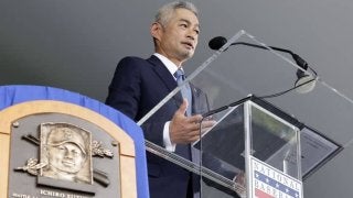 殿堂入りのプレートを横に英語によるスピーチを披露するイチロー氏(C)Getty Images 文字通りの歴史的な表彰とな…