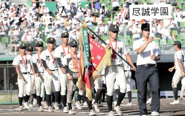 決勝で、一回表に2点を先制された尽誠学園は、その裏、連続三塁打などで5点を奪い逆転。七回には生田の中越え本塁打で突き放した。守備では二回以降、得点圏に走者を許しながら、相手を無得点に抑えた。