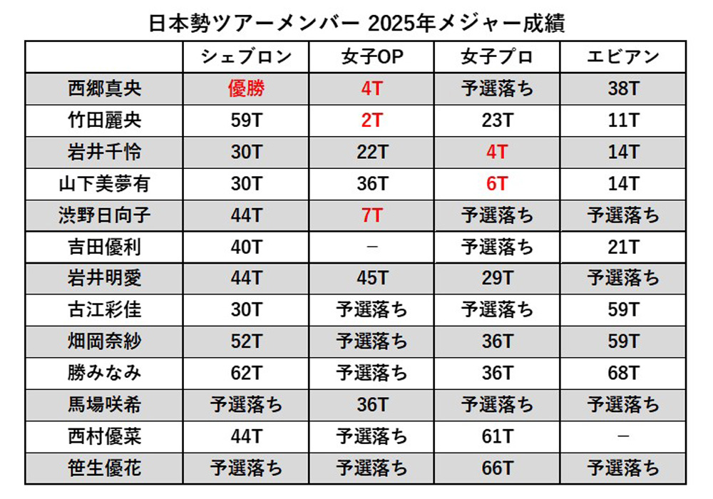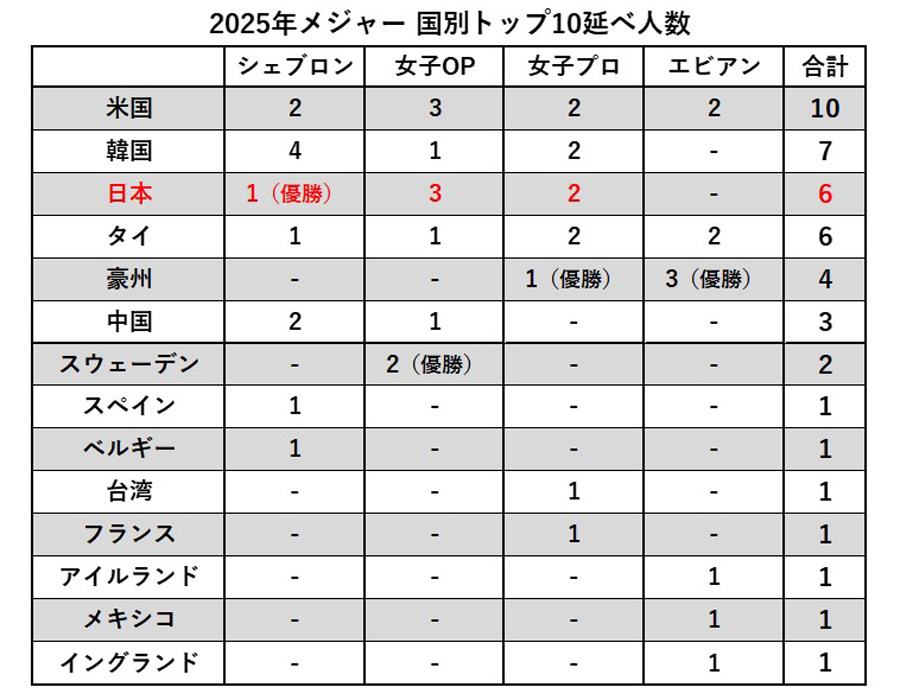 2025年の海外女子メジャーは4月「シェブロン選手権」を西郷真央が制するなど、日本勢が存在感を示している。第4戦を終えて3試合でトップ10に入り、国別の延べ人数は米国(10人)、韓国(7人)に次ぐ6人で、タイと並ぶ3番目の多さだ。活躍が目覚ましい今季メジャーを振り返る。