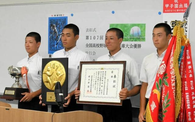 選手らは制服姿で参加し、優勝旗や盾を上田肇校長から改めて受け取った。渡辺拓雲主将(3年)は「これまで応援してくださった方々に、少しでも恩返しが出来るよう、春の選抜大会の悔しさをバネに、頂点をめざします」と語った。